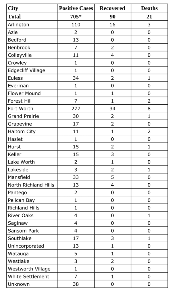 Data from Tarrant County Public Heath’s (TCPH) report of COVID-19 activity in Tarrant County, updated Friday, April 10, 2020. Find more COVID-19 information from TCPH here.