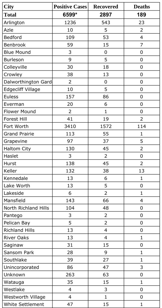 Data from Tarrant County Public Heath’s (TCPH) report of COVID-19 activity in Tarrant County, updated Wednesday, June 10, 2020. Find more COVID-19 information from TCPH here.