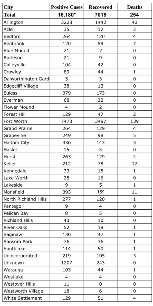 Data from Tarrant County Public Heath’s (TCPH) report of COVID-19 activity in Tarrant County, updated Wednesday, July 8, 2020. Find more COVID-19 information from TCPH here.