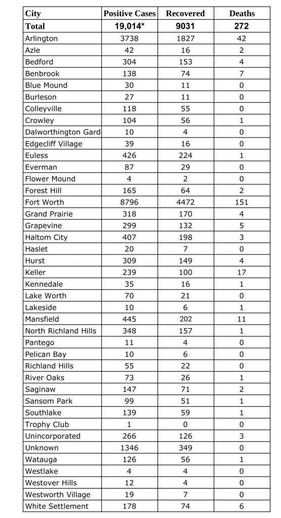 Data from Tarrant County Public Heath’s (TCPH) report of COVID-19 activity in Tarrant County, updated Tuesday, July 14, 2020. Find more COVID-19 information from TCPH here.
