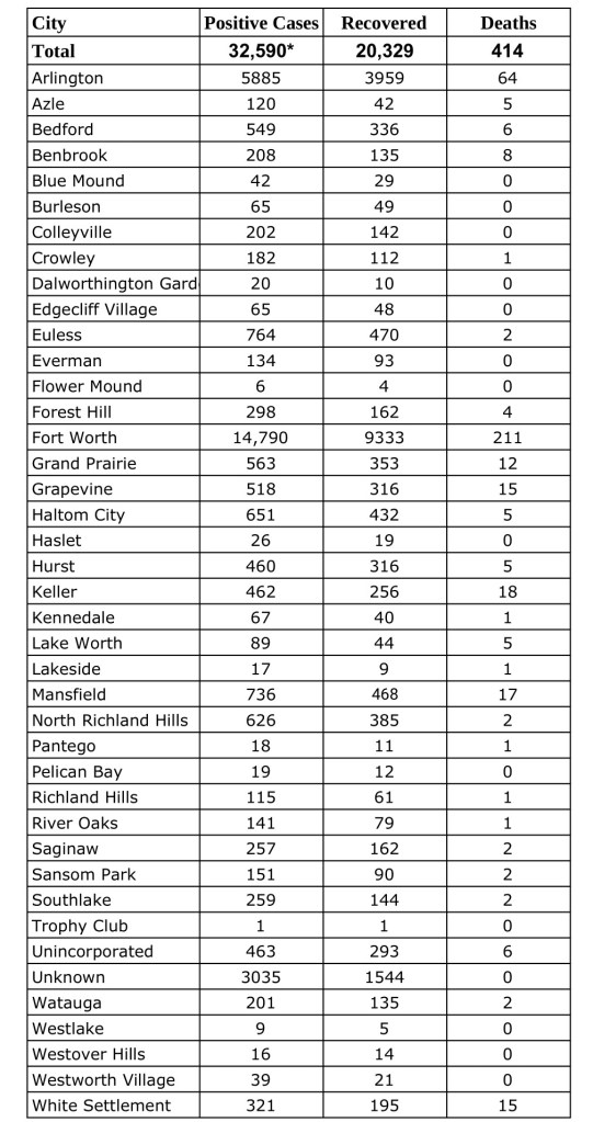 Data from Tarrant County Public Heath’s (TCPH) report of COVID-19 activity in Tarrant County, updated Friday, August 7, 2020. Find more COVID-19 information from TCPH here.