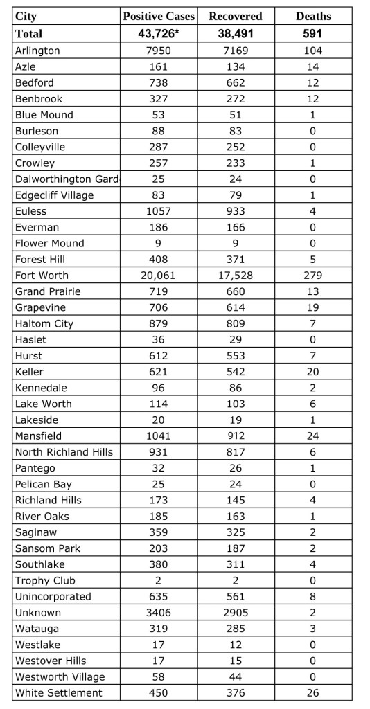 Data from Tarrant County Public Heath’s (TCPH) report of COVID-19 activity in Tarrant County, updated Thursday, September 10, 2020. Find more COVID-19 information from TCPH here.
