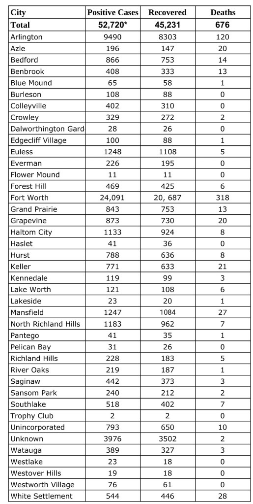 Data from Tarrant County Public Heath’s (TCPH) report of COVID-19 activity in Tarrant County, updated Tuesday, October 6, 2020. Find more COVID-19 information from TCPH here.