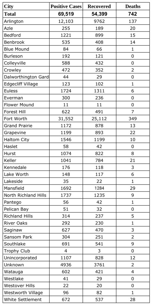 Data from Tarrant County Public Heath’s (TCPH) report of COVID-19 activity in Tarrant County, updated Tuesday, November 3, 2020. Find more COVID-19 information from TCPH here.