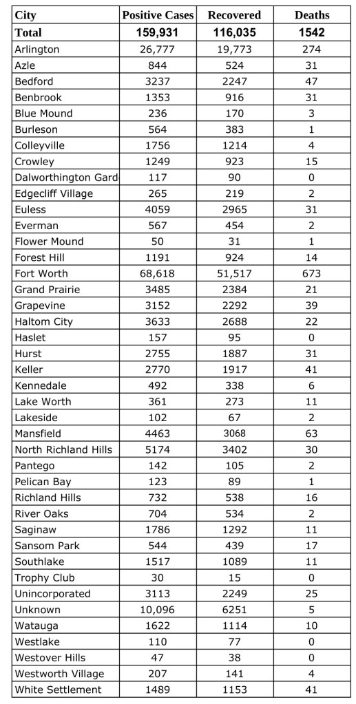 Data from Tarrant County Public Heath’s (TCPH) report of COVID-19 activity in Tarrant County, updated Monday, January 4, 2021. Find more COVID-19 information from TCPH here.