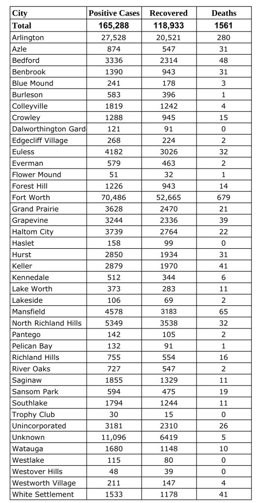 Data from Tarrant County Public Heath’s (TCPH) report of COVID-19 activity in Tarrant County, updated Wednesday, January 6, 2021. Find more COVID-19 information from TCPH here.