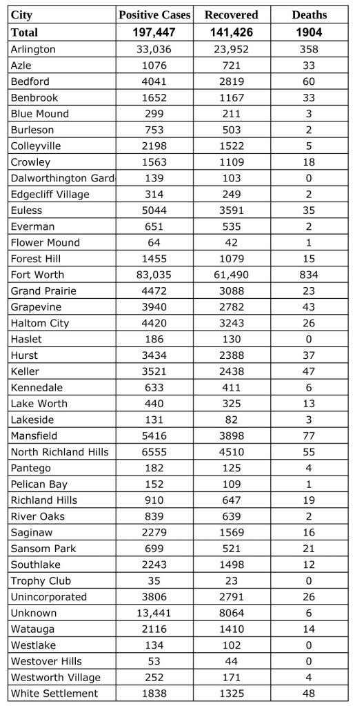 Data from Tarrant County Public Heath’s (TCPH) report of COVID-19 activity in Tarrant County, updated Tuesday, January 19, 2021. Find more COVID-19 information from TCPH here.