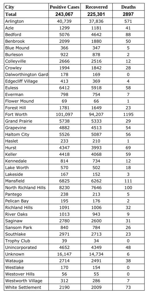 Data from Tarrant County Public Heath’s (TCPH) report of COVID-19 activity in Tarrant County, updated Tuesday, March 2, 2021. Find more COVID-19 information from TCPH here.