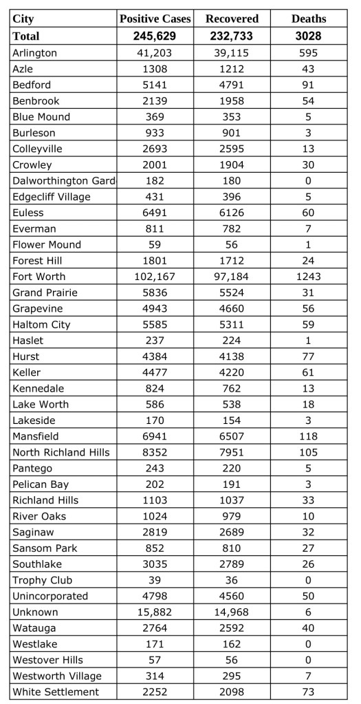 Data from Tarrant County Public Heath’s (TCPH) report of COVID-19 activity in Tarrant County, updated Tuesday, March 9, 2021. Find more COVID-19 information from TCPH here.