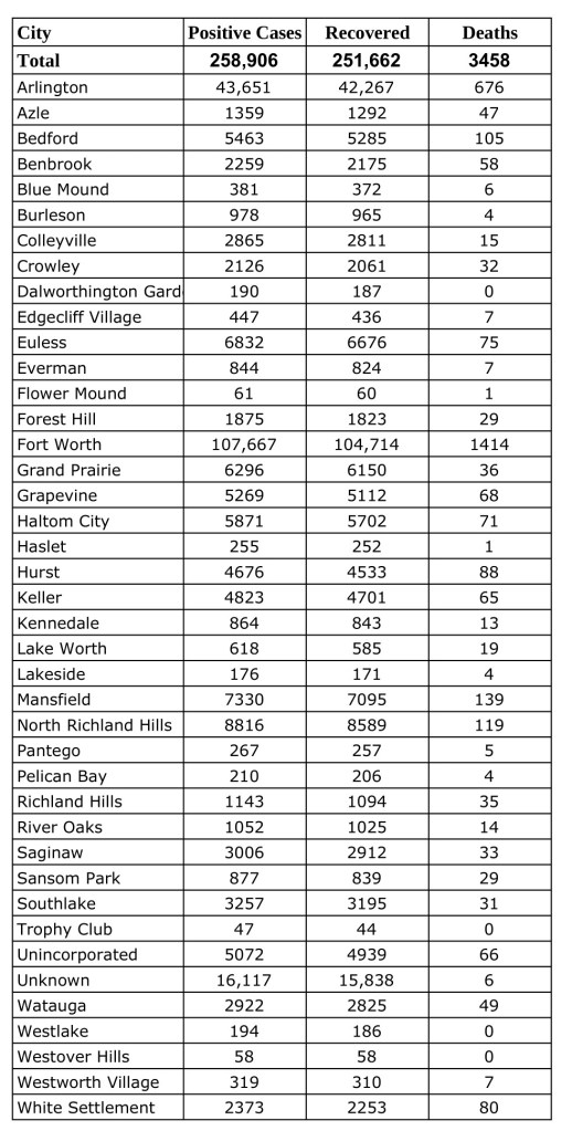 Data from Tarrant County Public Heath’s (TCPH) report of COVID-19 activity in Tarrant County, updated Thursday, May 13, 2021. Find more COVID-19 information from TCPH here.