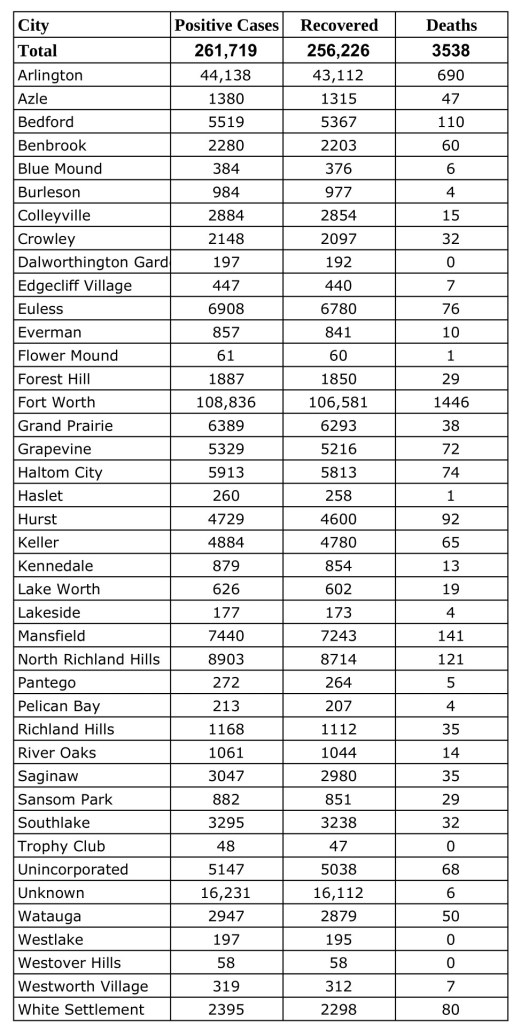 Data from Tarrant County Public Heath’s (TCPH) report of COVID-19 activity in Tarrant County, updated Friday, June 11, 2021. Find more COVID-19 information from TCPH here.