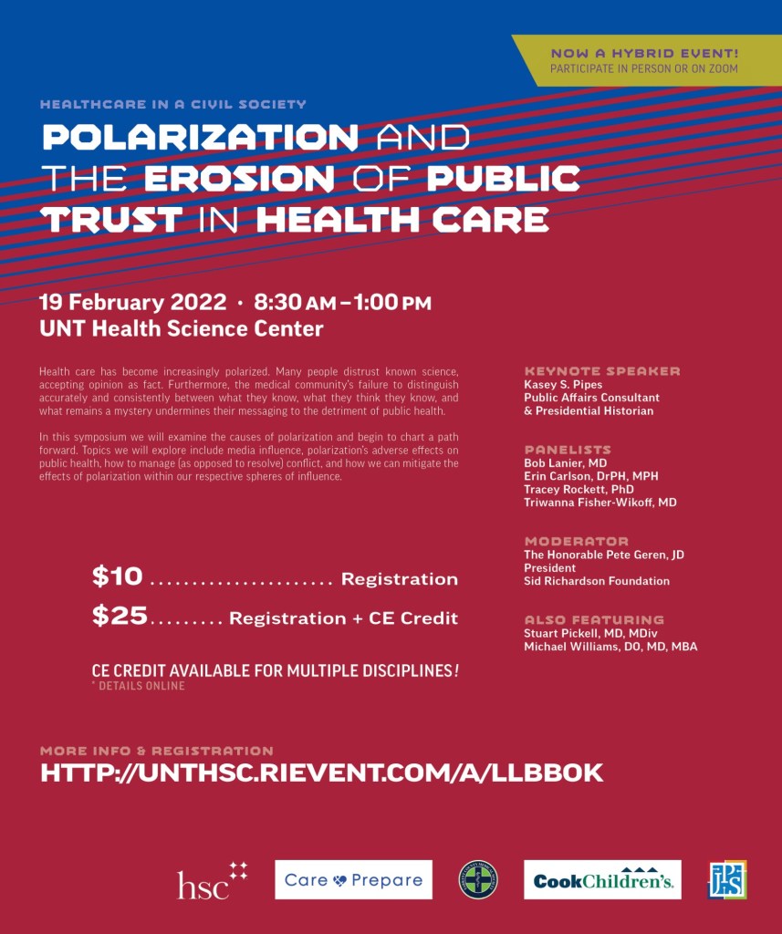 Our nation is beset by radical polarization and erosion of trust. On Saturday, February 19th from 8:30 to 1:00 p.m., Tarrant County Medical Society’s Ethics Consortium will present a CME symposium entitled “Healthcare in a Civil Society 2022” that will explore the factors that have contributed to our present state of bifurcation.