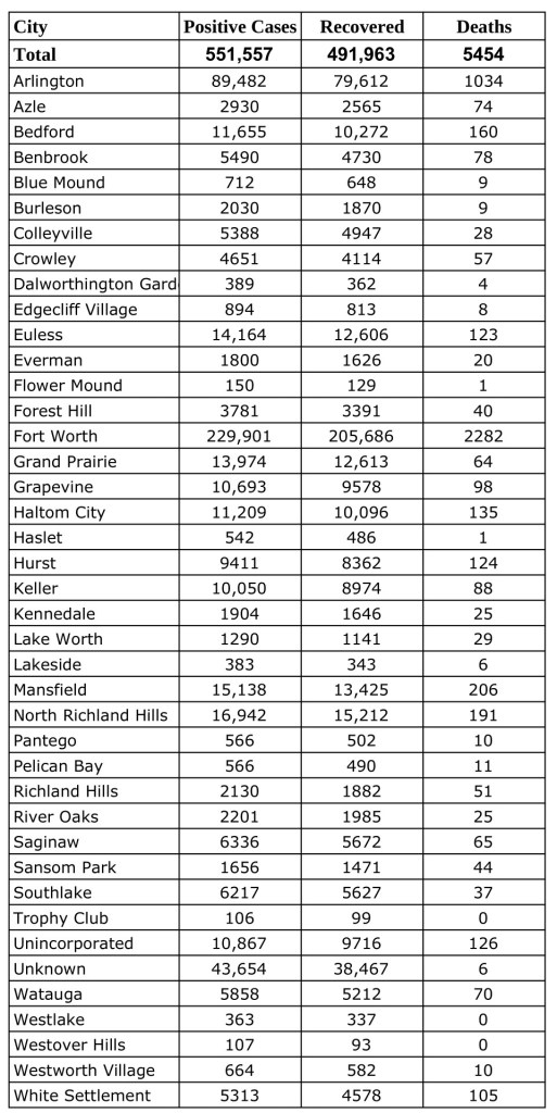 Data from Tarrant County Public Heath’s (TCPH) report of COVID-19 activity in Tarrant County updated Tuesday, February 15, 2o22. Find more COVID-19 information from TCPH here.