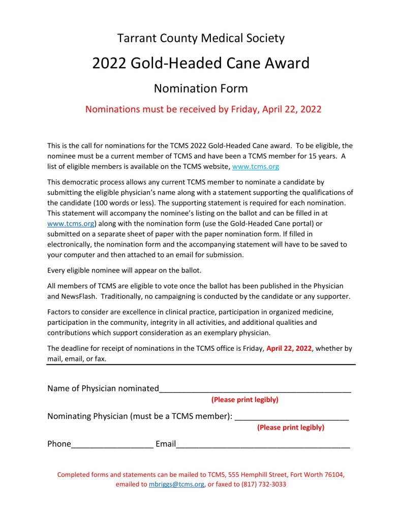 Physicians, nominations are now open for the 2022 Gold-Headed Cane Award, which is given annually to an outstanding TCMS member who has made a significant impact on our medical community.
