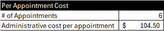 This chart shows the cost of Nancy’s care through Project Access—the “real dollars” spent on her prescreening and enrollment processes and coordination of her medical care to completion. In Nancy’s case, the full administrative cost is $627. Since she had six appointments, this leads to an average cost of $105 per medical appointment.