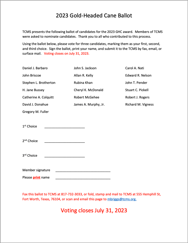 Nominations for the 2023 Gold-Headed Cane Award, which is given annually to an outstanding TCMS member who has made a significant impact on our medical community, are now open.