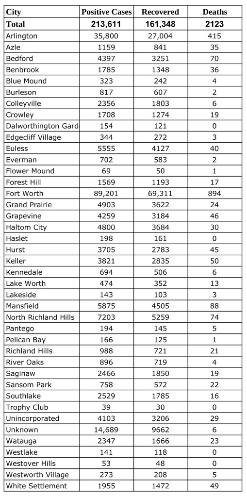 Data from Tarrant County Public Heath’s (TCPH) report of COVID-19 activity in Tarrant County, updated Tuesday, January 19, 2021.Find more COVID-19 information from TCPH here.