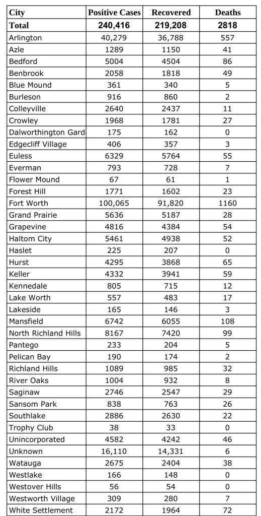 Data from Tarrant County Public Heath’s (TCPH) report of COVID-19 activity in Tarrant County, updated Thursday, February 25, 2021.Find more COVID-19 information from TCPH here.